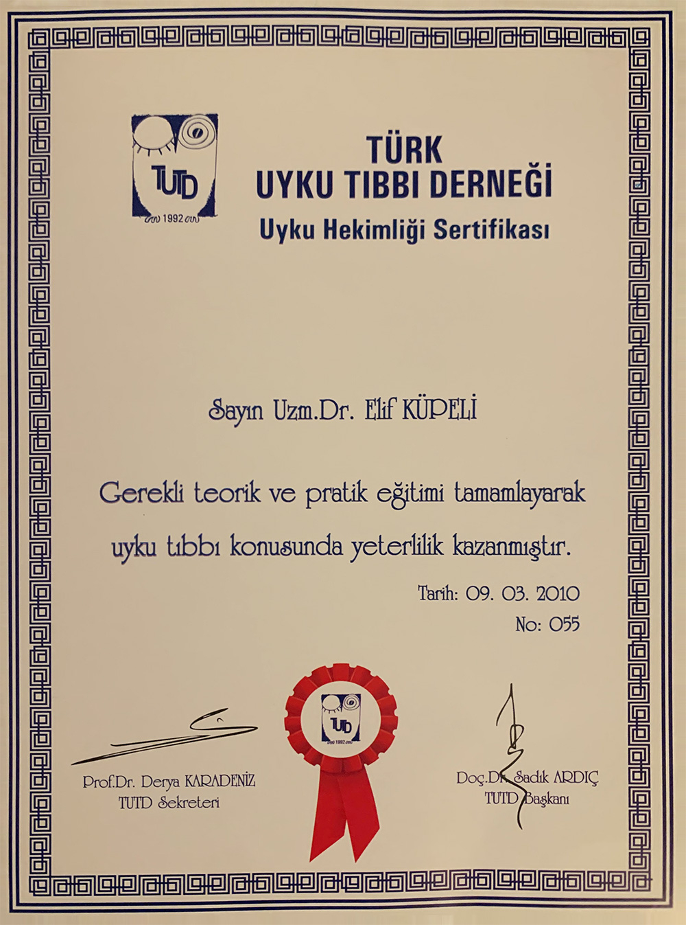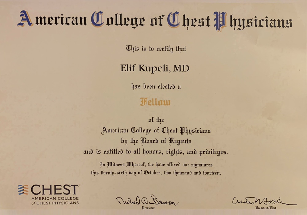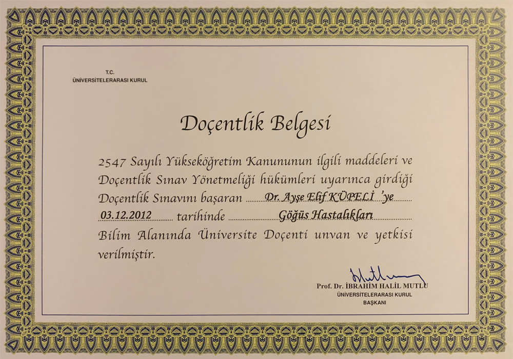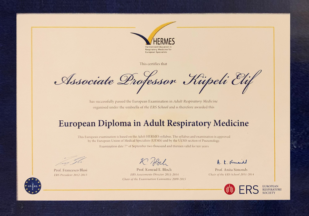 2013 yılında Göğüs Hastalıkları alanında ”Avrupa Yeterlilik Belgesini” almaya hak kazandım. 2018 yılında Akciğer Nakli konusunda Sağlık Bakanlığınca sertifiye oldum ve sertifika aldım. Halen Başkent Üniversitesi Tıp Fakültesi Göğüs Hastalıkları Anabilim Dalı’nda görev yapmaktayım.