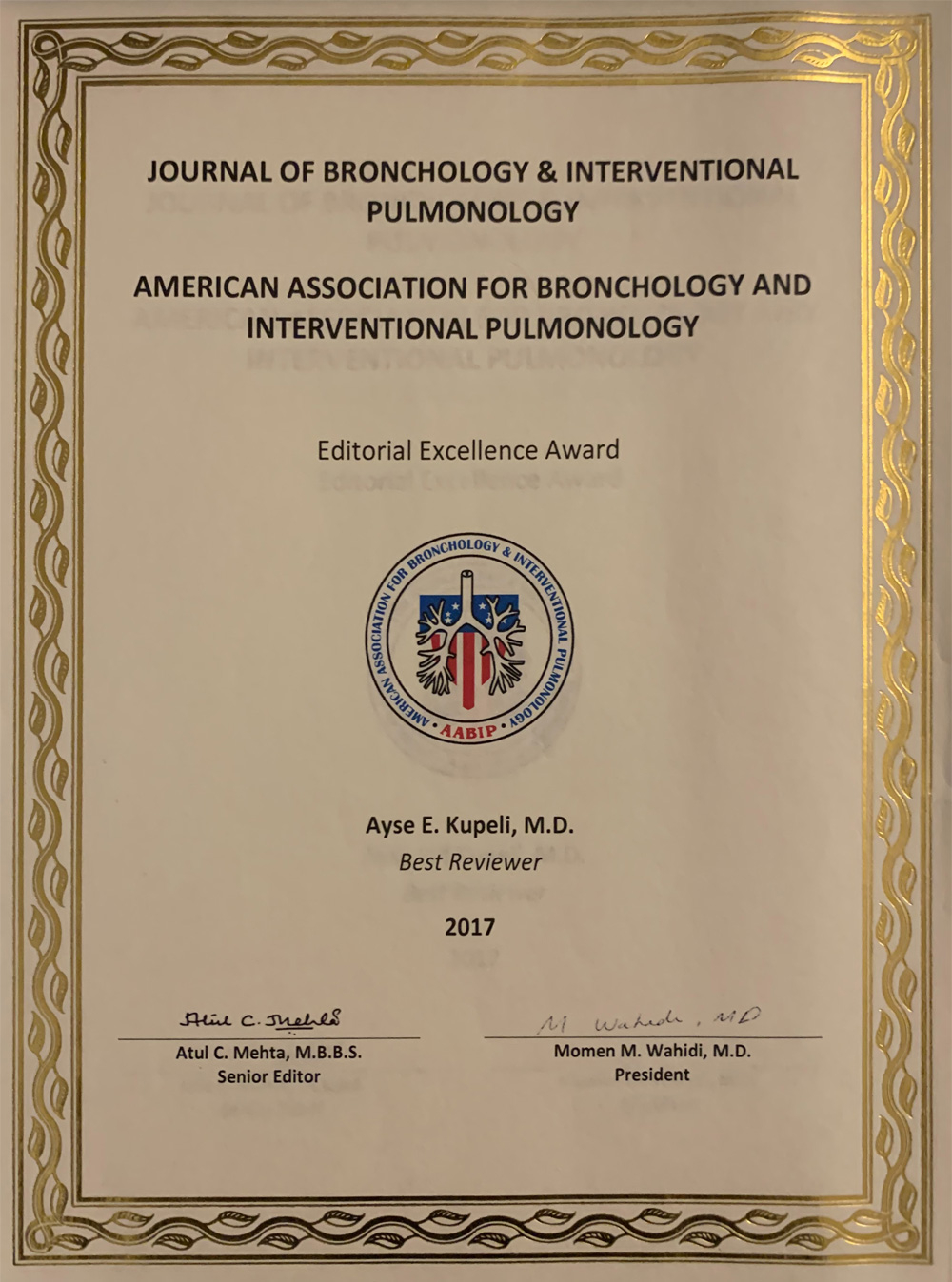 American Association of Bronchology and Interventional Pulmonology,Journal of Bronchology and Interventional Pulmonology. “EDİTORİAL EXCELLENCE AWARD”. Kanada,Toronto,28/10/2017